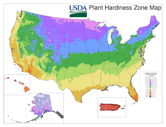 - This standard map produced by the USDA divides the US into zones according to minimum temperatures reached during the winter.