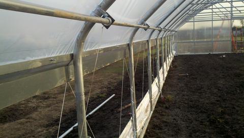 The Drop-Down Sidewall ventilation option not only provides ample ventilation, but also functions as a windbreak when in the open position, protecting delicate crops from the coldest air at the base of the tunnel. This sidewall ventilation option utilizes a rotating drive shaft running the length of the structure, which is connected to the curtain, raising and lowering using a manual hand crank or a thermostatically operated motor. A variety of customizations make this ventilation option ideal for many climates and budgets.