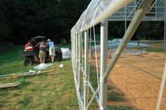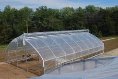 Our plug-in roof system was developed in collaboration with Eliot Coleman. He saw a need for venting the hot air that accumulates in the peak of the mid-section of longer greenhouses. Venting this air allows for longer plastic life and better crop growing conditions. Our vents are operated by wax cylindars, which automatically open between 75 and 85 degrees. That way there is no need to run electricity to them.
